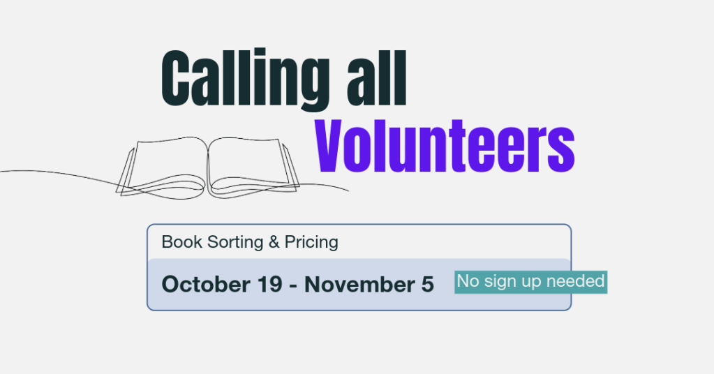 From October 19 to November 5, our team will be sorting and pricing thousands of donated books — and we’d love your help!